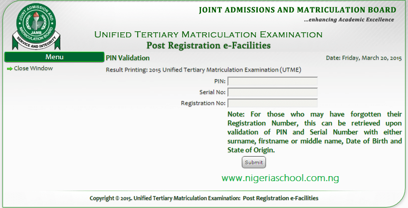 step 2. When the page loads up, Enter the E-facility PIN and Serial number where required followed by your JAMB Registration Number.